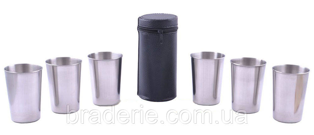 Набір похідних склянок із неіржавкої сталі. У комплекті шість склянок об'ємом 150 мл. Склянки постачаються в шкіряному чохлі на блискавці, компактно складаються, не займають багато місця в туристичних походах.Вибрати інші похідні склянки та чарки